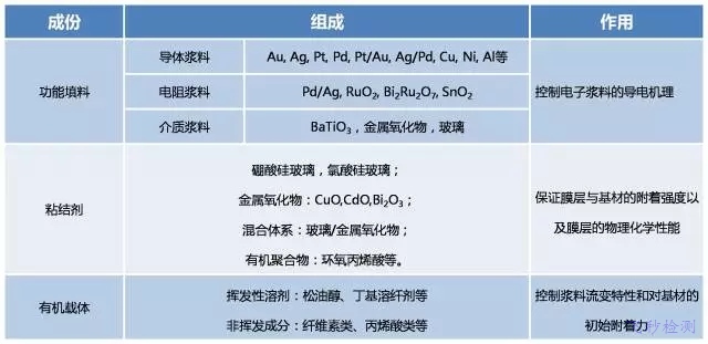 飛秒說 電子漿料的功能填料、粘結劑以及有機載體三組分,常見用料和功能可參考下表。