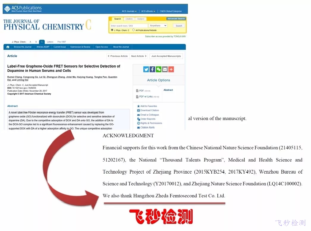實驗發現多巴胺在飛秒檢測時間尺度內快速和阿霉素-石墨烯(DOX-GO)作用,發出明顯的紅光。通過飛秒檢測的項目資助研究使得該方法在配方分析、產品質量監控、藥物研發、未知物成分分析、疾病診斷等方面走向應用。該成果已經發表在美國化學會(ACS)著名期刊The Journal of Physical Chemistry C (物理化學頂級雜志)。