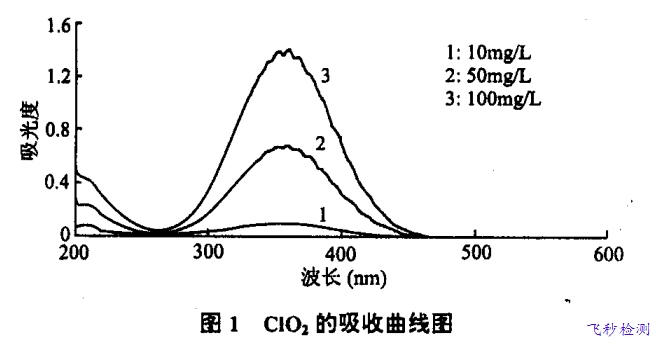使用石英比色皿,采用紫外可見分光光度計在190nm~600nm波長范圍內(nèi)掃描,觀察二氧化氯水溶液特征吸收峰,二氧化氯的最大吸收峰在360nm處,可做為定性依據(jù)。但氯氣在吃也有弱吸收,產(chǎn)生干擾。應采用二氧化氯水溶液在430nm處的吸收,吸光度與二氧化氯含量成正比,且氯氣、ClO2-、ClO3-、ClO-在此無吸收,可作為定量依據(jù)。
