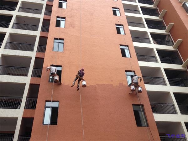 3、主涂層(真石漆)施工:待底涂層完全干燥后(一般需4-6),即可進(jìn)行施工,根據(jù)不同的裝飾要求,先進(jìn)行試驗(yàn)噴涂,以確定施工所需的壓力、噴槍口徑及噴涂量,一般5kg/m2。單色主涂層:分兩次噴涂為宜。涂膜未干燥前,即可噴涂第二道。套色主涂層:可選用雙管真石漆噴槍或單管真石漆噴槍分次噴涂。